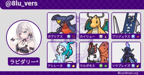 ▽最終日対戦集 https://youtu.be/eZKb8ADn3YQ 目次 目次 はじめに 構築経緯 コンセプト 個体紹介 選出 結果 最後に はじめに ここではお久しぶりです8luです。 本記事はシーズン25で使用した構築の紹介となります。 シーズン26からはルールが変わってしまい…